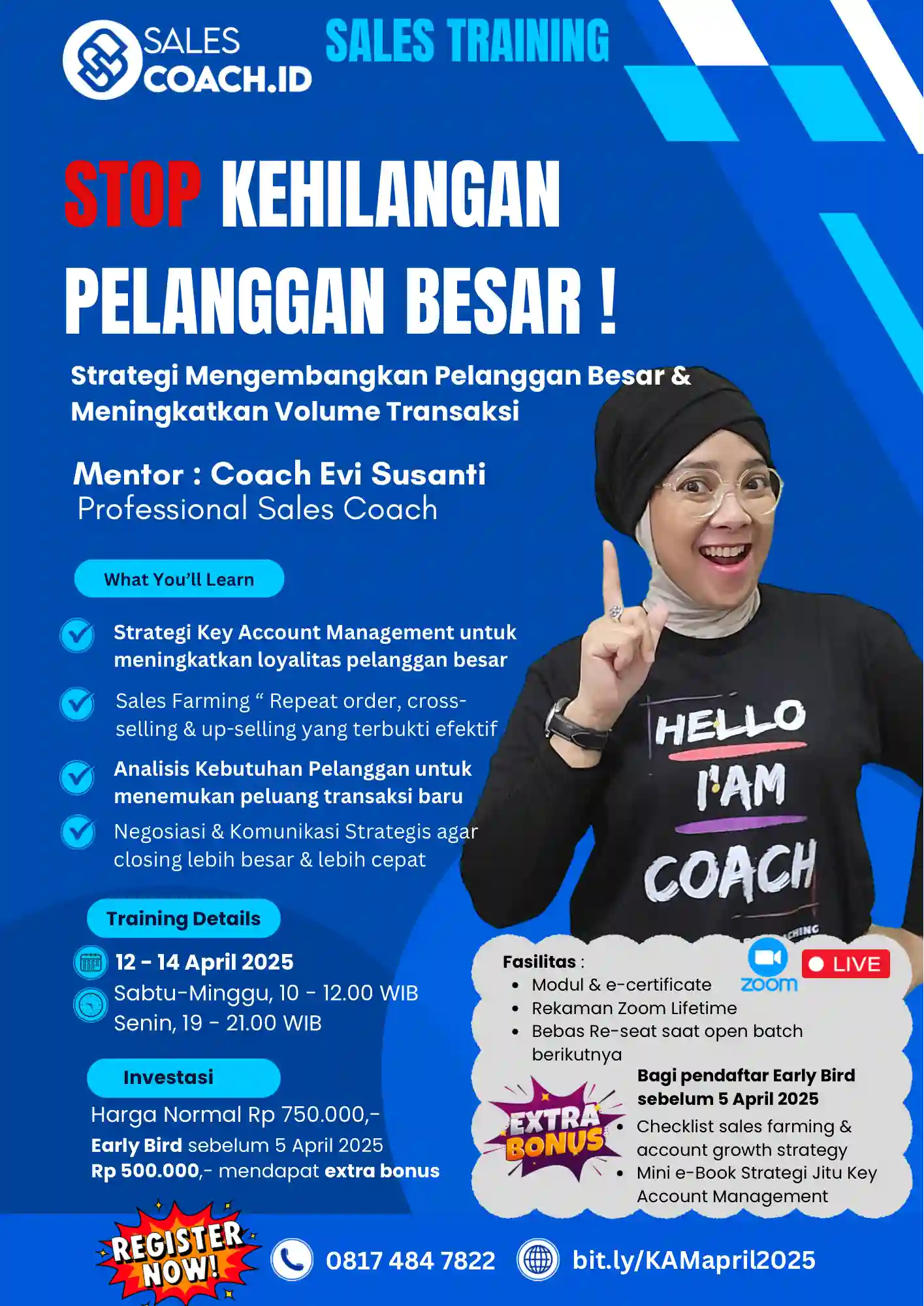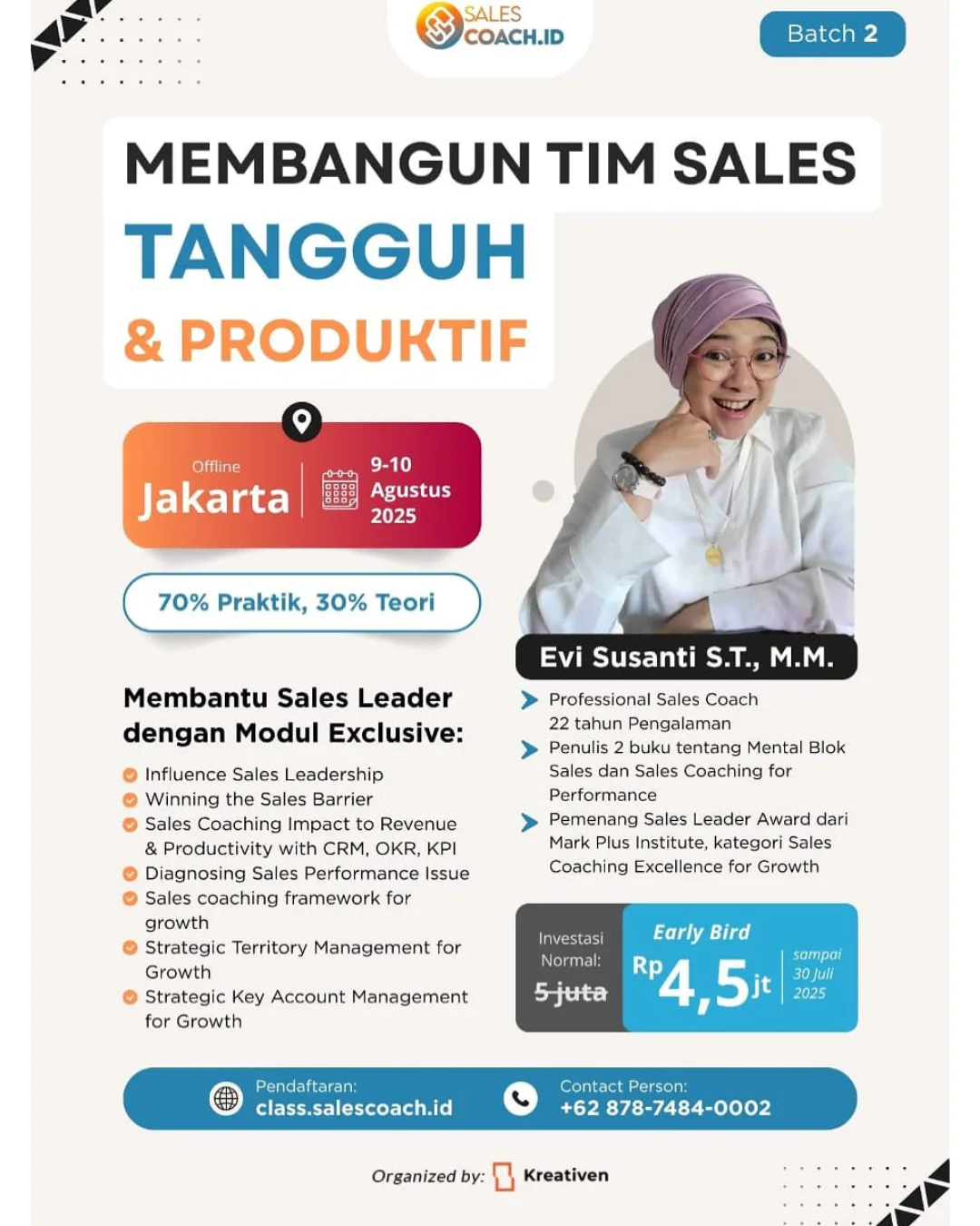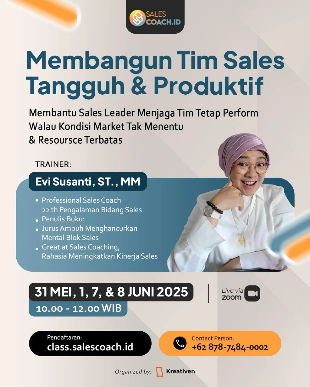 Sebagai seorang coach yang terampil, Coach Evi tidak hanya fokus pada pencapaian target penjualan, tetapi juga pada pengembangan keterampilan interpersonal, motivasi, dan strategi efektif untuk mencapai hasil yang optimal.